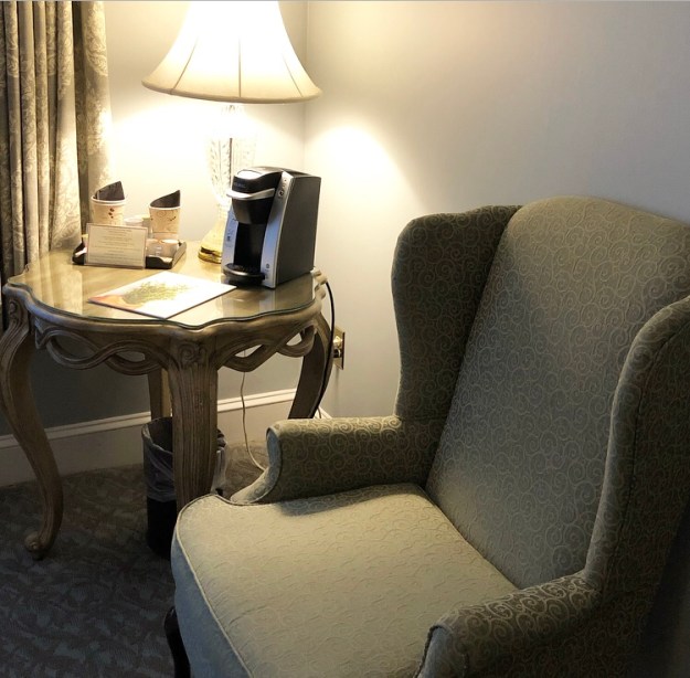 - We stayed in the detached Fessenden Wing — we had two queen beds, a table with a Keurig, wingback chairs, a flatscreen TV, and a nice bathroom with two sinks (which was a nice touch!) It was the perfect spot to get some writing or reading done, to work on a puzzle with your family, to have a cup of coffee or tea, and to enjoy some downtime. The room was clean, comfortable, and cozy. You can’t go wrong with any of the rooms at this hotel — some rooms even have a fireplace and a whirlpool tub!